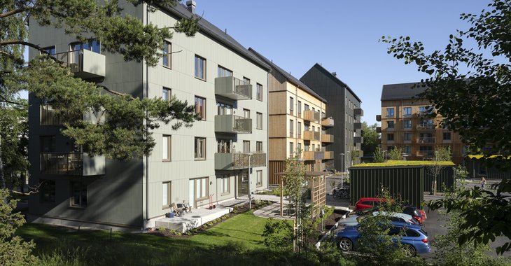 Att bygga industriellt i trä är framtidens hållbara byggmetod och vi har under snart 100 år utvecklat vår byggprocess genom innovation och kvalitetssäkring. Att bygga med oss innebär att ni som kund får en byggprocess och ett hus med lägre klimatpåverkan, upp till 70 % lägre om man inkluderar kolsänkan. Tyréns har utrett klimatpåverkan från industriellt producerade flerbostadshus i trä och i rapporten konstaterar de att träbyggnaderna som undersökts har en kolinbindning som motsvarar 75 till 86 procent av den totala klimatpåverkan från material och byggskedet. Med rätt val av leverantörer och rätt materialval när det gäller gips, isolering, armering och betong kan man reducera ytterligare 30 procent och med det till och med närma sig nollpunkten: klimatneutrala hus.