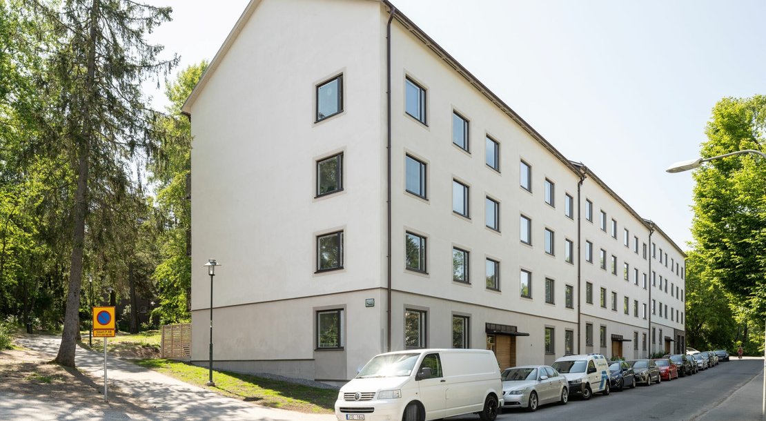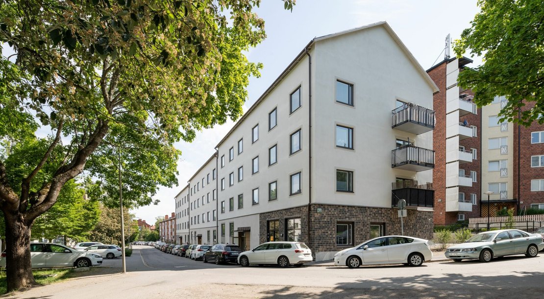 En huskropp med tre trapphus, enligt Stockholmshusens gestaltning med putsfasad. 35 lägenheter, inga komplementbyggnader. Beläget i Bandhagen, Stockholm.