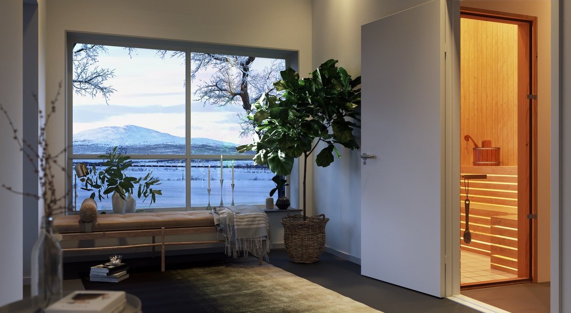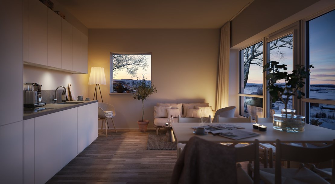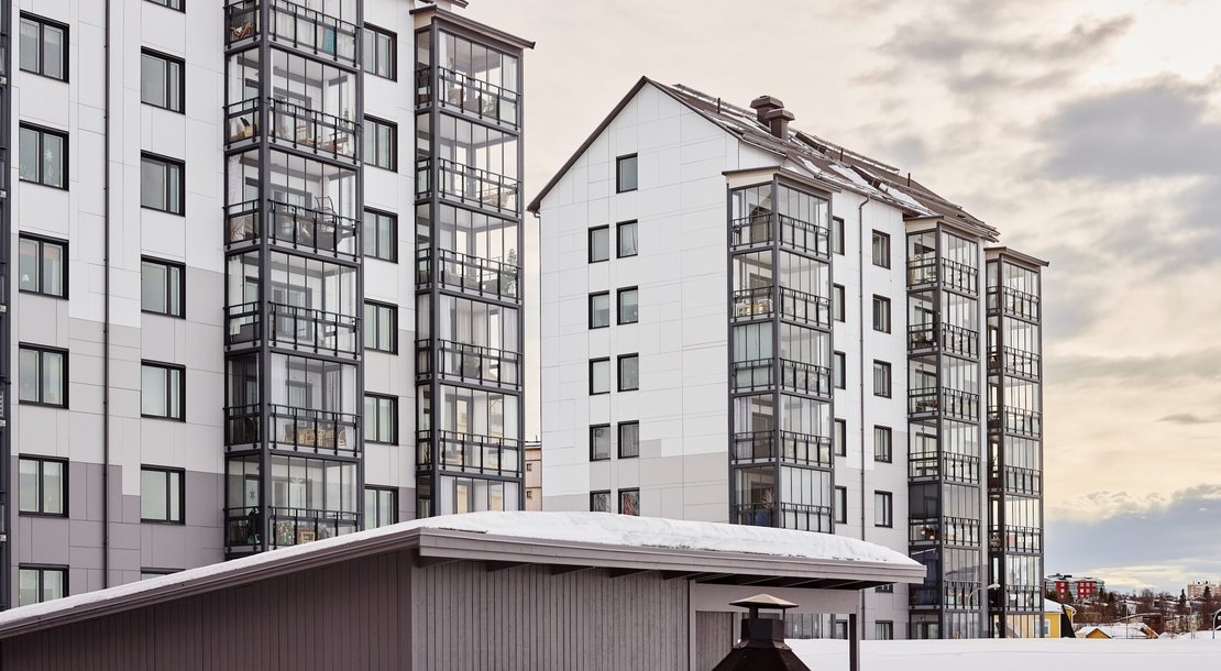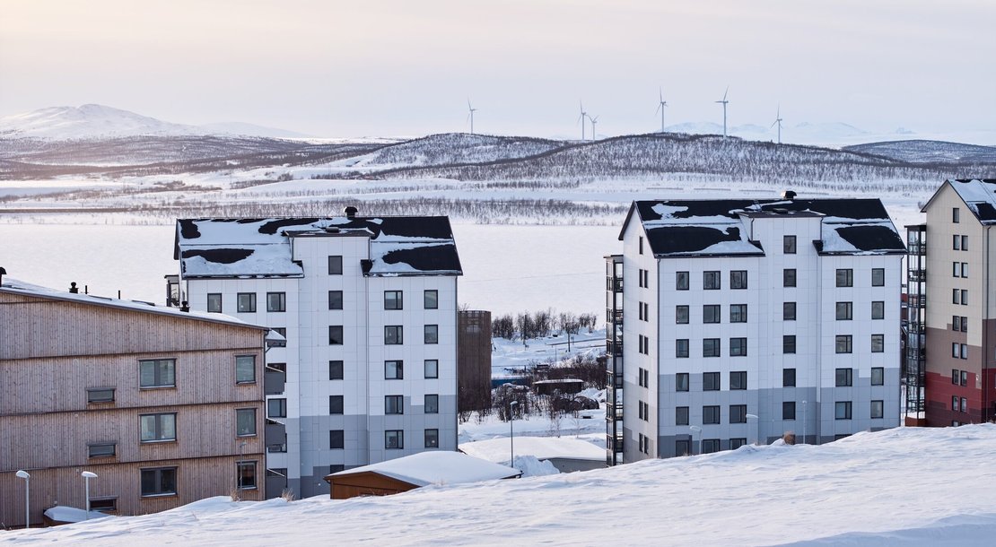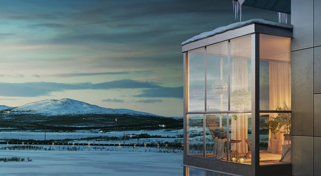 Bostäder i Kiruna med stora balkonger och milsvid utsikt över Kebnekaises fjällvärld, där slalombacke och skoterled finns alldeles utanför dörren.
